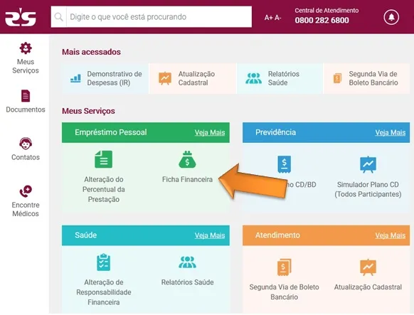 Acesse aqui caso tenha dúvidas sobre como efetuar login e senha. Após acessar o Portal de Serviços, selecione a opção Ficha Financeira.