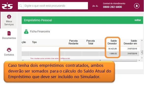 Anote o valor do Saldo Devedor para posterior preenchimento no simulador. Caso tenha dois empréstimos contratados, conforme o exemplo abaixo, some os dois valores.